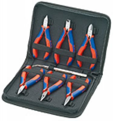 7件套(6件为电子剪钳,1件为精密的镊子)箱包采用聚酯面料,并配有拉链,钳子用弹力带固定