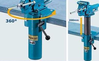 配合固定式台虎钳使用(本装置未配台虎钳)。 可以十分轻松地在0-200m m 高度自动升降, 根据使用者身高不同立刻调整到合适高度。 还可以根据工件所处角度在0-360°范围内调节台虎钳。 松开安全手柄,打开锁紧装置,气压弹簧向上产生极大弹力, 推动台虎钳向上,上弹力超过重力,调节高度时感觉不到台虎钳重量